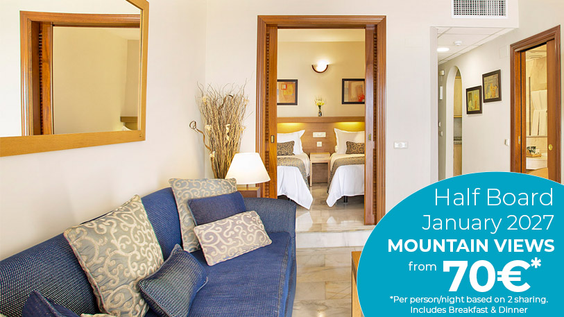 from 70€** per person per night including Half Board (buffet breakfast and dinner), based on 2 sharing a studio-apartment (mountain view) in January 2027.