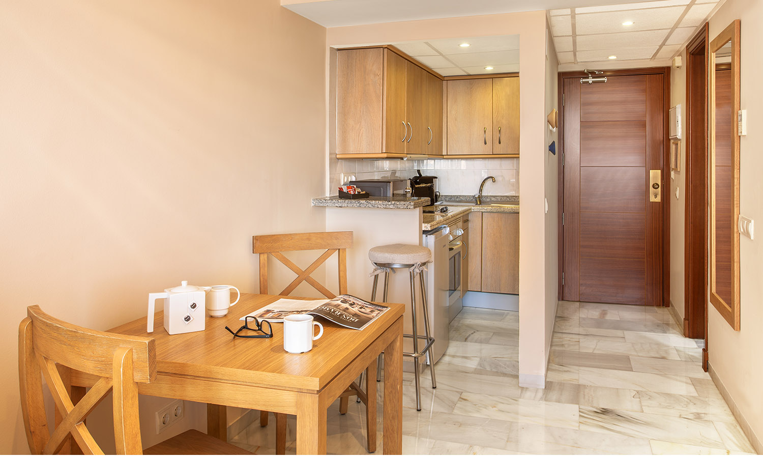 Sunset Beach Club ofrece estudios con vistas al mar que combinan elegancia y confort para una perfecta estancia en la Costa del Sol. Tamaño aproximado: 28m2. Ocupación máxima 2 personas.