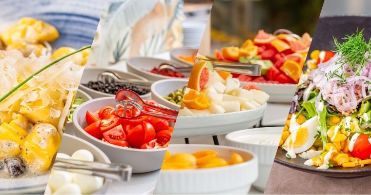 All our evening buffets feature a salad bar and a fresh fruit section, and our hot food section always offers a choice of healthy proteins (fish and meat) alongside vegetables and rice.