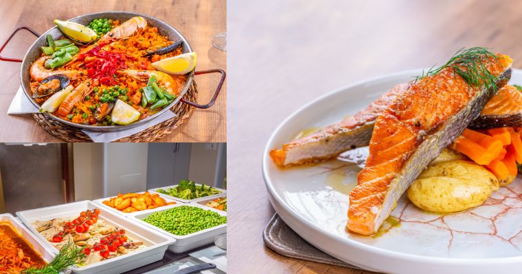 Let’s start with our buffets. During breakfast we have an extensive choice of fresh fruits and salads and at dinner, there’s a great selection of salads, both self-service as well as ready-made mini salads (prawn cocktails, potato salas and more!). At dinner you’ll also have a choice of fish and vegetables as main courses as well as rice, potato or pasta to accompany dishes.